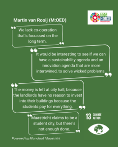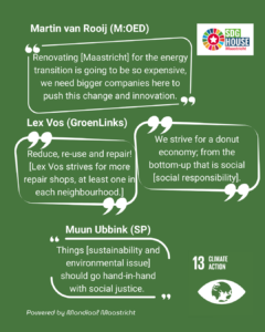 Het was een informerend en respectvol debat, de panelleden werden getest en getoetst over hun standpunten door de moderators Joana Buss, KAN en Juno Brussel, SDG House Maastricht. KAN en SDG House Maastricht willen de panelleden bedanken voor hun inzet en aanwezigheid op de korte termijn: Cedric van Gerwen (D66), Martin van Rooij (M:OED), Kathelijn Teeuwen (PvdD), Lore Eckelmans (Volt), Lex Vos (GroenLinks) en Muun Ubbink (SP).