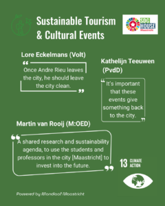 Het thema van de avond was duurzaamheid: een circulaire economie voor Maastricht, de energietransitie in Maastricht en de vraag of het mogelijk is om over te stappen naar een duurzamere manier van evenementenorganisatie in Maastricht. Denk hierbij aan TEFAF en André Rieu.