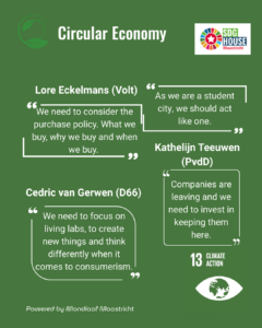 Het thema van de avond was duurzaamheid: een circulaire economie voor Maastricht, de energietransitie in Maastricht en de vraag of het mogelijk is om over te stappen naar een duurzamere manier van evenementenorganisatie in Maastricht. Denk hierbij aan TEFAF en André Rieu.