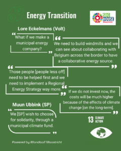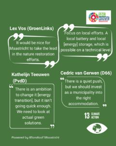 Het was een informerend en respectvol debat, de panelleden werden getest en getoetst over hun standpunten door de moderators Joana Buss, KAN en Juno Brussel, SDG House Maastricht. KAN en SDG House Maastricht willen de panelleden bedanken voor hun inzet en aanwezigheid op de korte termijn: Cedric van Gerwen (D66), Martin van Rooij (M:OED), Kathelijn Teeuwen (PvdD), Lore Eckelmans (Volt), Lex Vos (GroenLinks) en Muun Ubbink (SP).
